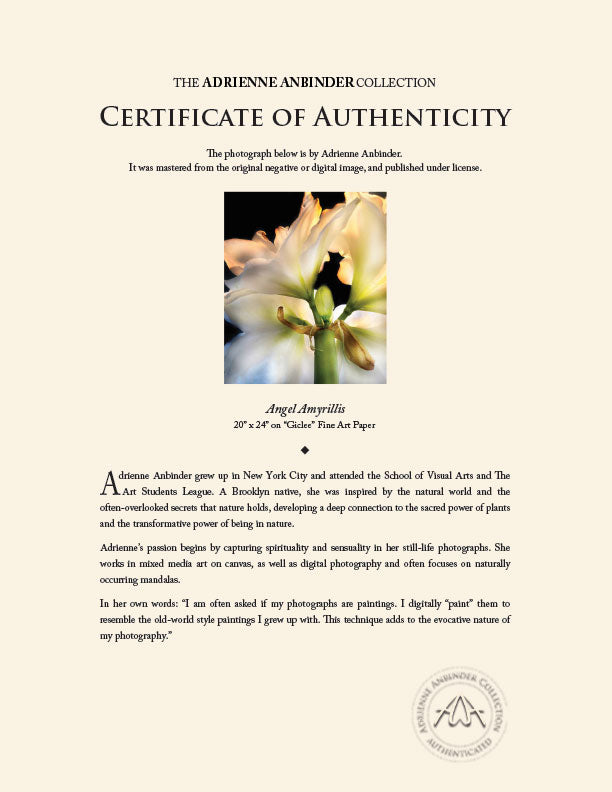 This photograph is from The Adrienne Abinder's "Floral and Abstract Wall Art" Collection. It was mastered from the original negative or digital image and published under a licensing agreement and is printed on high quality archival fine art paper. Each print comes with an authorized Certificate of Authenticity.