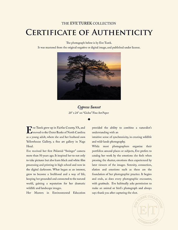 Eve received her first Polaroid "Swinger" camera more than 50 years ago. It inspired her to not only to take pictures but also learn black and white film processing and printing in high school and now in the digital darkroom. What began as an interest, grew to become a livelihood and a way of lift, keeping her grounded and connected to the natural world, gaining a reputation for her dramatic wildlife and landscape images.