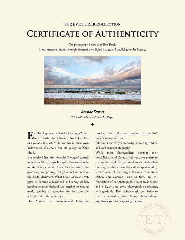 Eve received her first Polaroid "Swinger" camera more than 50 years ago. It inspired her to not only to take pictures but also learn black and white film processing and printing in high school and now in the digital darkroom. What began as an interest, grew to become a livelihood and a way of lift, keeping her grounded and connected to the natural world, gaining a reputation for her dramatic wildlife and landscape images.