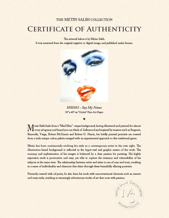 This artwork is created by Metin Salih, an International artist. Metin Salih hails from a “Mad Men” –esque background; having illustrated and painted for almost every ad agency and brand you can think of. Influenced and inspired by masters such as Sargeant, Reynolds, Varga, Robert McGinnis and Robert G. Harris, his boldly painted portraits are created from a truly unique color palette merged with an experimental approach to this traditional genre.